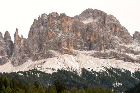 Mountain landscape with snow and coniferous forest in Dolomites, Italy