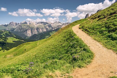 Dirt road and hiking trail track in Dolomites mountain, Italy, in front of Pizes de Cir Ridge mountain ranges in Bolzano, South Tyrol, Northwestern Dolomites, Italy.