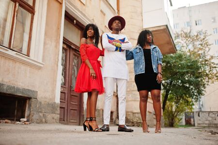 Group of three stylish trendy afro france friends posed at autumn day. Black african man model with two dark skinned womans.