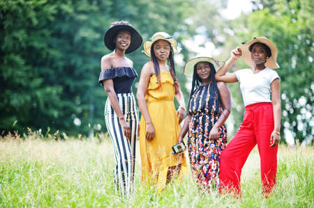 Group of four gorgeous african american womans wear summer hat spending time at green grass in park.