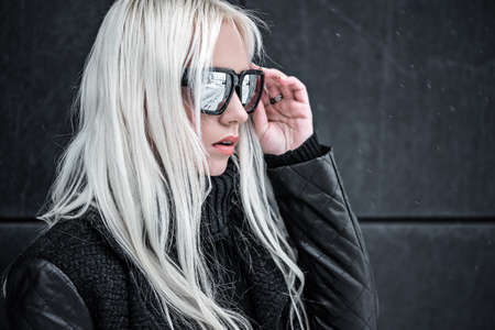Stylish blonde in futuristic clothes and glasses on a mirror background.