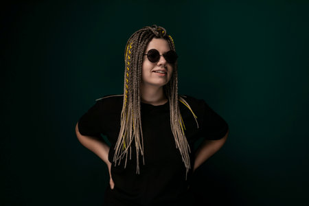 Young pretty girl with unusual hairstyle near glowing green neon light of the city at night. Dyed blue hair in braids. Pensive hipster teenager in glasses.