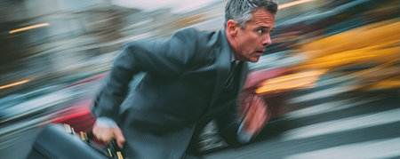 A businessman runs through a city street with a briefcase, captured in a motion blur.
