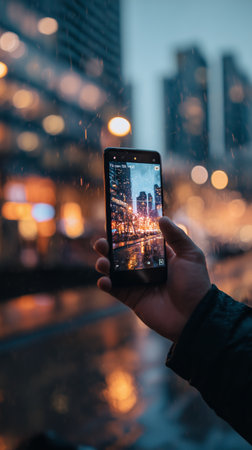 A person holds a smartphone that reflects urban lights and rain-soaked streets. Buses with illuminated fronts create a vibrant atmosphere during a rainy evening..