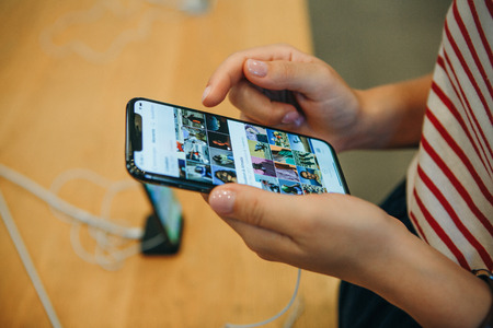 Aachen, Germany, September 28, 2015: close up shot of a young man uses instagram app on the new apple iphone 6s in the office