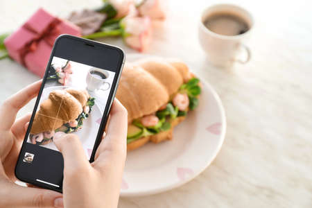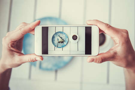Food photography woman hands make photo cake with smartphone / taking photo food for post and share on social networks with camera smart phone in restaurant