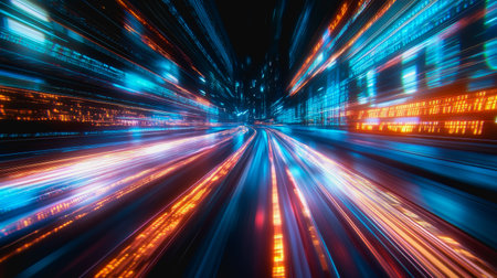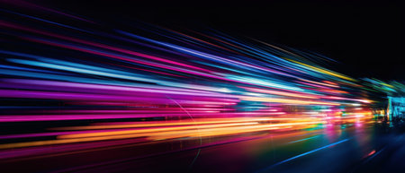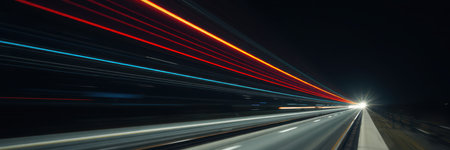 Nighttime highway lights create dynamic streaks of color in a long exposure shot, showcasing fast-moving vehicles along the road