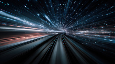 Light tunnel with speed effect moving through a star field. Ideal for technology, science, and futuristic concepts.