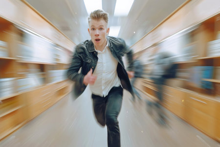 A young man runs through a library with shelves blurring in the background, his face showing a look of urgency.