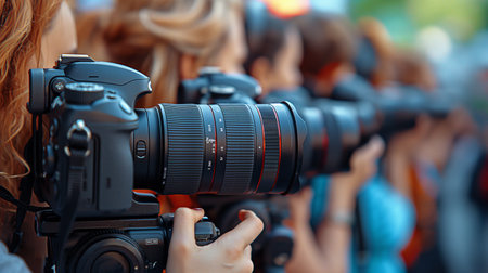 A large group of photographers stands in a city street, raising cameras high to capture the event unfolding in front of them. The warm glow of the golden hour highlights the excitement and energy of the gathering.