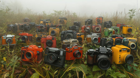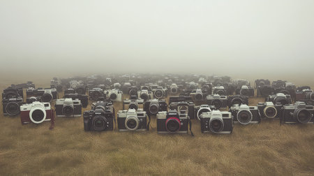 A captivating assortment of vintage cameras laid out in a foggy field, highlighting the beauty of photography equipment surrounded by dreamlike mist.