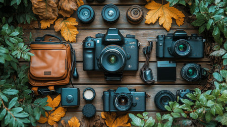 A flat lay composition featuring vintage cameras and accessories, artfully arranged with autumn leaves for a nostalgic vibe.