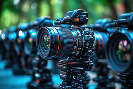 A collection of high-end cameras is arranged neatly on tripods, capturing an outdoor event. Photographers are gathered, focusing on their subjects while enjoying the pleasant weather.