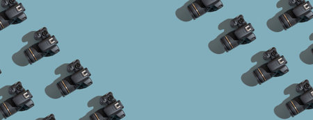 Banner with pattern from many cameras on a colored background with copy space. World Photography Day concept