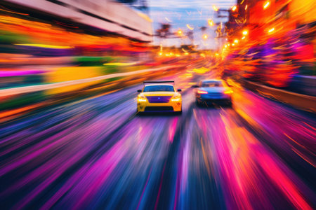 Captivating urban scene depicting a high-speed car race at night, featuring vibrant lights, colorful reflections, and dynamic movement through the city streets.