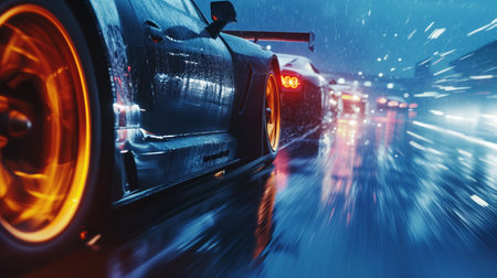 Sport car motion blur of race between two cars in blue hour, rain with lights on road. Sport car on wet asphalt, high speed
