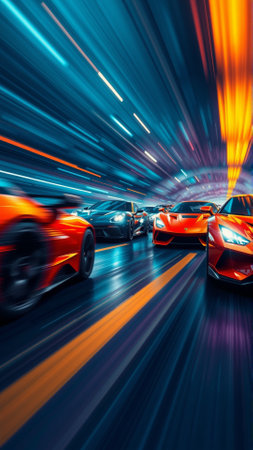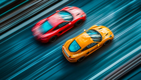 Vibrant sports cars blur along a twisting highway, capturing adrenaline and agility in a striking display of speed and vivid color contrast.