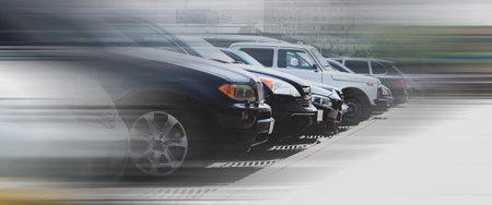 Modern cars parked in a neat row within a parking garage or ship, showcasing a sense of order and anticipation for upcoming journeys and adventures in transportation