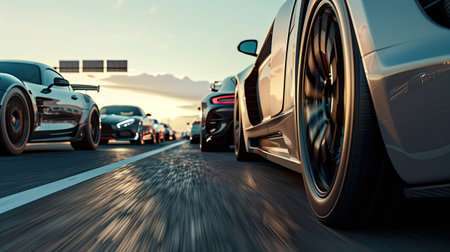 A group of cars driving down a street side by side, creating a dynamic and energetic scene, A dramatic slow motion scene of sports cars zooming past the finish line, AI Generated