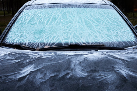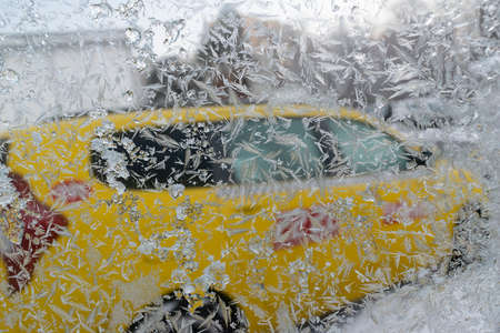 Frost Patterns on Car. A car covered in intricate frost patterns on a cold morning,