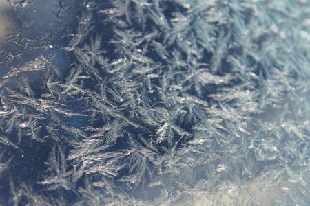 Winter ice pattern on the frozen window. Texture, background for inserting text. New Year theme. Winter. Cold.