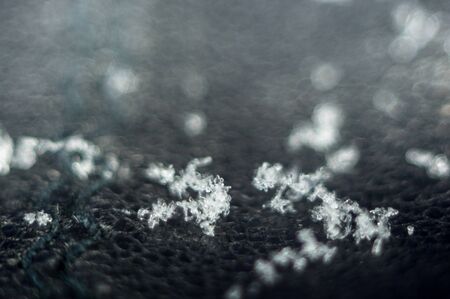 Winter or Christmas background with snow crystals close-up, selective focus. Frost patterns, copy space, snowy and frozen surface on the lake