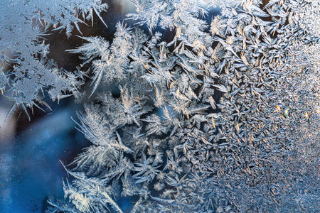 Frosty natural pattern on a winter window, texture of frosty patterns, dendritic image structure