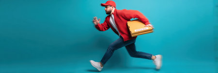 Courteous courier with a pizza box hurries through a colorful backdrop, reflecting the urgency of his delivery mission on a lively day.