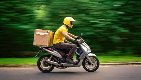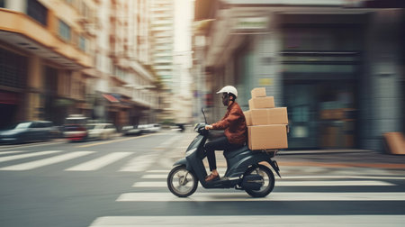 Delivery man on scooter with cardboard boxes on the road in motion blur