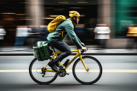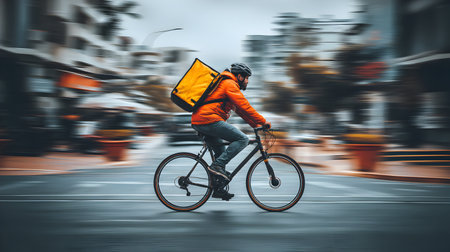 A food delivery man rushes through a bustling city on his bicycle, his bright backpack visible in motion blur as he navigates through traffic. AI Generative AI