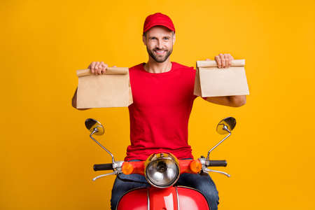 Photo of cheerful guy ride bike hold two paper packages wear red t-shirt headwear isolated yellow color background