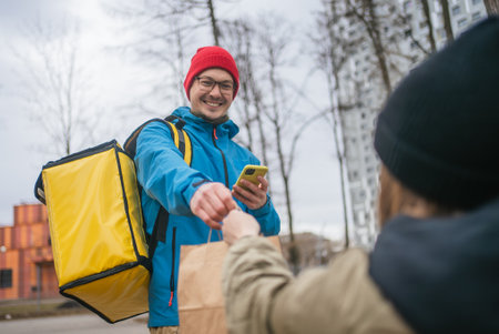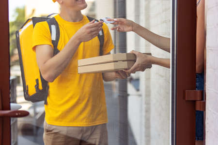 Close-up hands of deliveryman delivers order to clients, customers, buyers. Work, career, different professions concept. Idea of convenience, speed, comfort, safety, service.