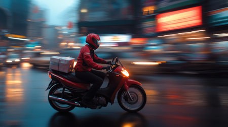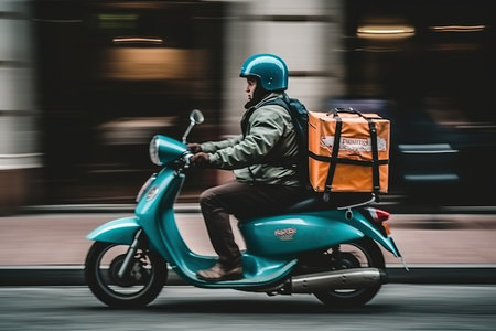 A food delivery man in a helmet and bright backpack speeds through the busy streets on his motorbike. The motion blur of the city's lights adds to the feeling of speed and urgency. AI Generative AI.