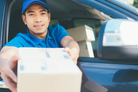 Smiling cheerful thai delivery man on blue working custume carrying cardboard boxes.