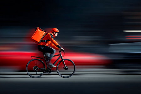 Fast cyclist courier riding through city streets with motion blur and dynamic light, ideal for delivery apps and urban mobility campaigns.