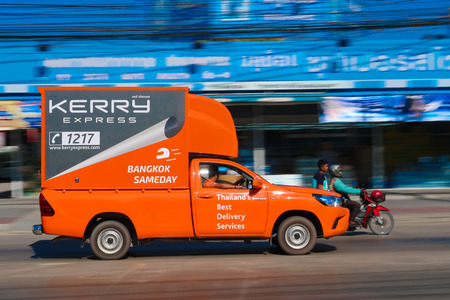The Kerry express logistic truck running on street for send box to customer on June,05,2018 at Bangkradi Road,Bangkok,thailand.