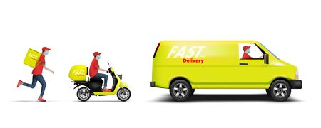 Quarantine Delivery. Online Order Fast Express Delivery Concept. Courier In Protective Mask On Foot, Driving Bike, Car. EPS10 Vector