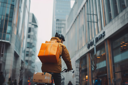 Courier with bicycle delivering packages in city. Online order by courier with backpack on bicycle