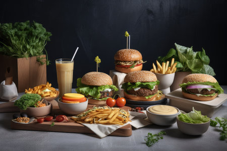 A beautiful display of various fast food items including burgers, crispy fries, fresh salads, and savory dips, perfect for a casual dining experience.