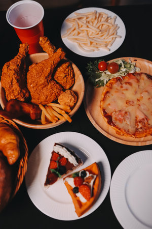 A vibrant assortment of tasty fast foods featuring pizza, crispy fries, chicken nuggets, pasta, and cookies arranged attractively for gatherings.