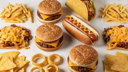 Classic Fast Food Assortment with Burgers, Hot Dog, Fries, and Nachos