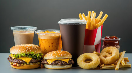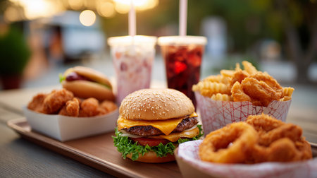 A vibrant fast food meal showcasing a juicy burger, crispy fries, refreshing soda, creamy milkshake, and delightful desserts, perfect for food lovers.