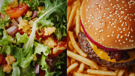 A split-screen image showing a vibrant salad on one side and a fast-food burger and fries on the other, illustrating diet and food choice dilemmas.