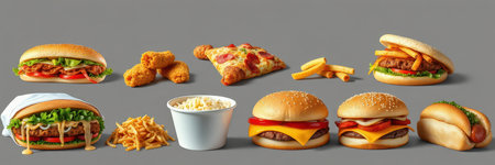 Stylized representations of burgers, fries, and pizza are arranged attractively on a vivid background, showing their appetizing appeal.