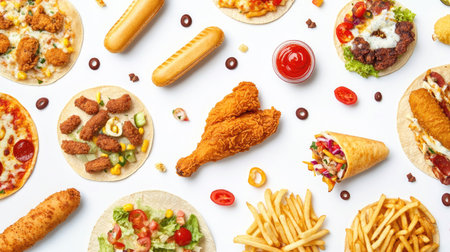 Fast food variety on white background onion rings, sandwich, fried chicken, pizza, hamburger