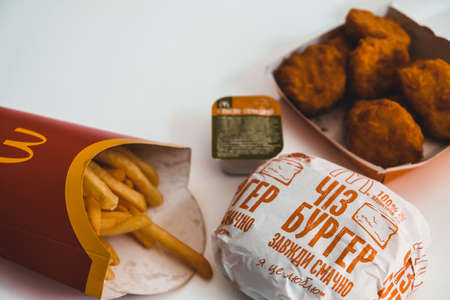 Lviv / Ukraine - April 2020: Whole meal from Ukrainian Mcdonalds on a white table at home. Unhealthy eating during coronavirus outbreak. Ordering takeaway meal in isolation. White space for copy.