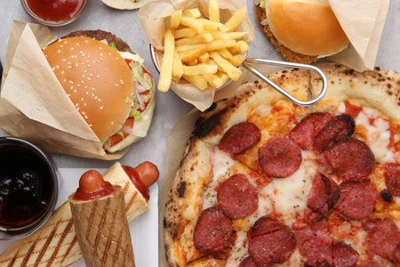 Various fast food items displayed on a gray surface showcasing different flavors and textures