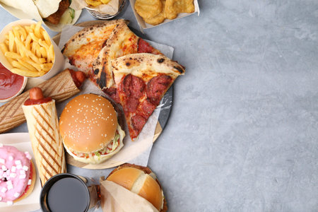 Different delicious fast food and soda drink on grey table, flat lay. Space for text