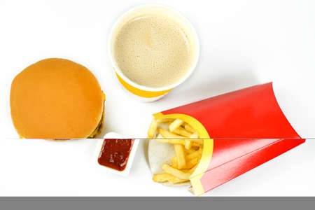Fast food set containing burgers, french fries and soft drink isolated on white background.