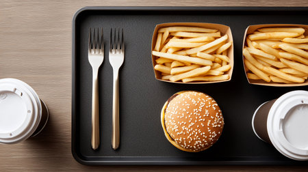 Chic fast food setup, minimalist design on white background, beautifully arranged table